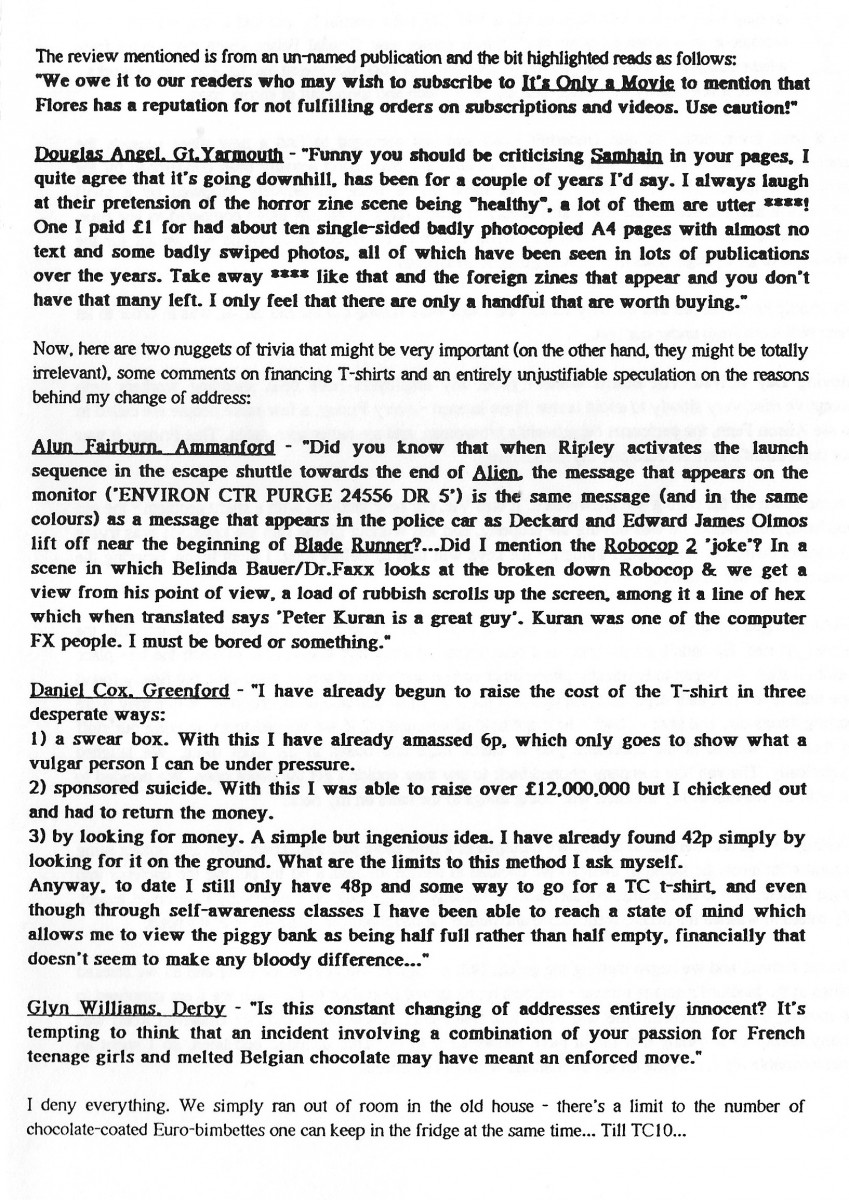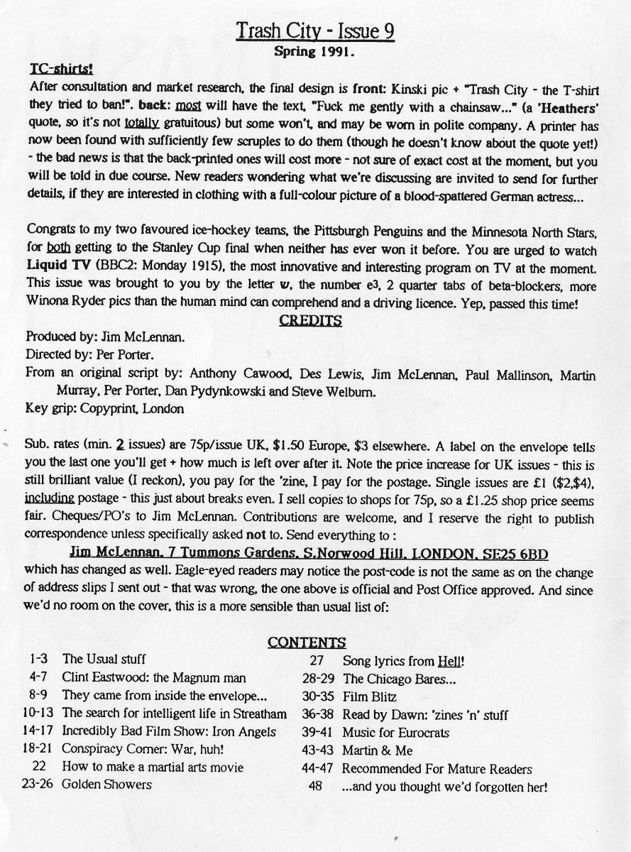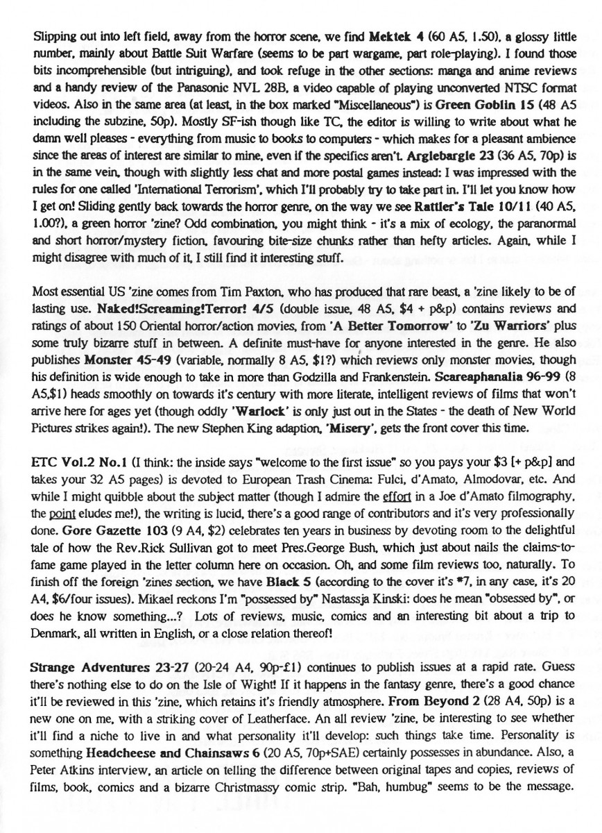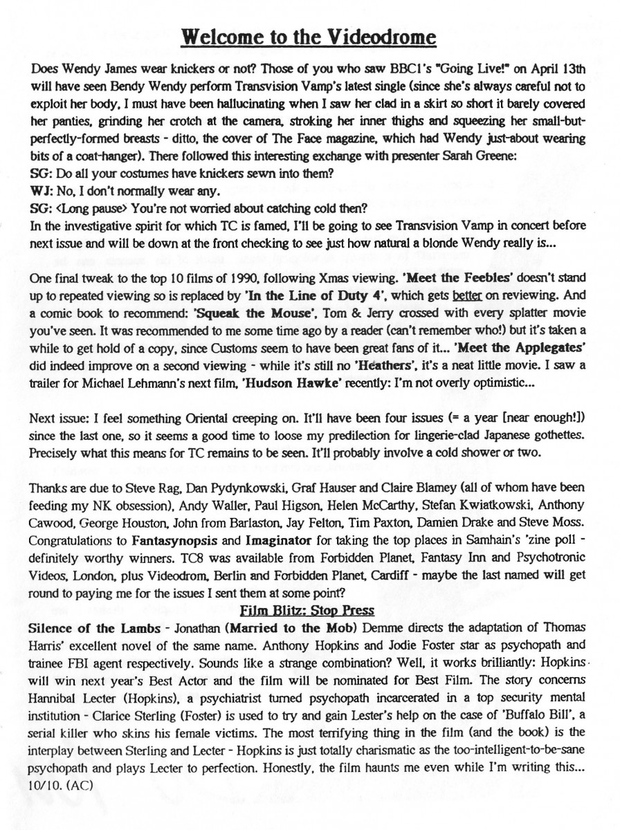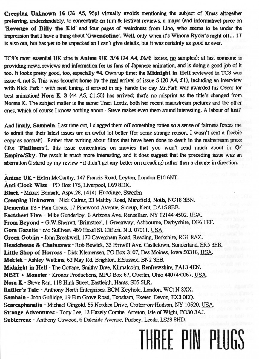 Thanks are due to Steve Rag, Dan Pydynkowski, Graf Hauser and Claire Blamey (all of whom have been feeding my NK obsession), Andy Waller, Paul Higson, Helen McCarthy, Stefan Kwiatkowski, Anthony Cawood, George Houston, John from Barlaston, Jay Felton, Tim Paxton, Damien Drake and Steve Moss. Congratulations to Fantasynopsis and Imaginator for taking the top places in Samhain’s ‘zine poll – definitely worthy winners. TC8 was available from Forbidden Planet, Fantasy Inn and Psychotronic Videos, London, plus Videodrom, Berlin and Forbidden Planet, Cardiff – maybe the last named will get round to paying me for the issues I sent them at some point?
