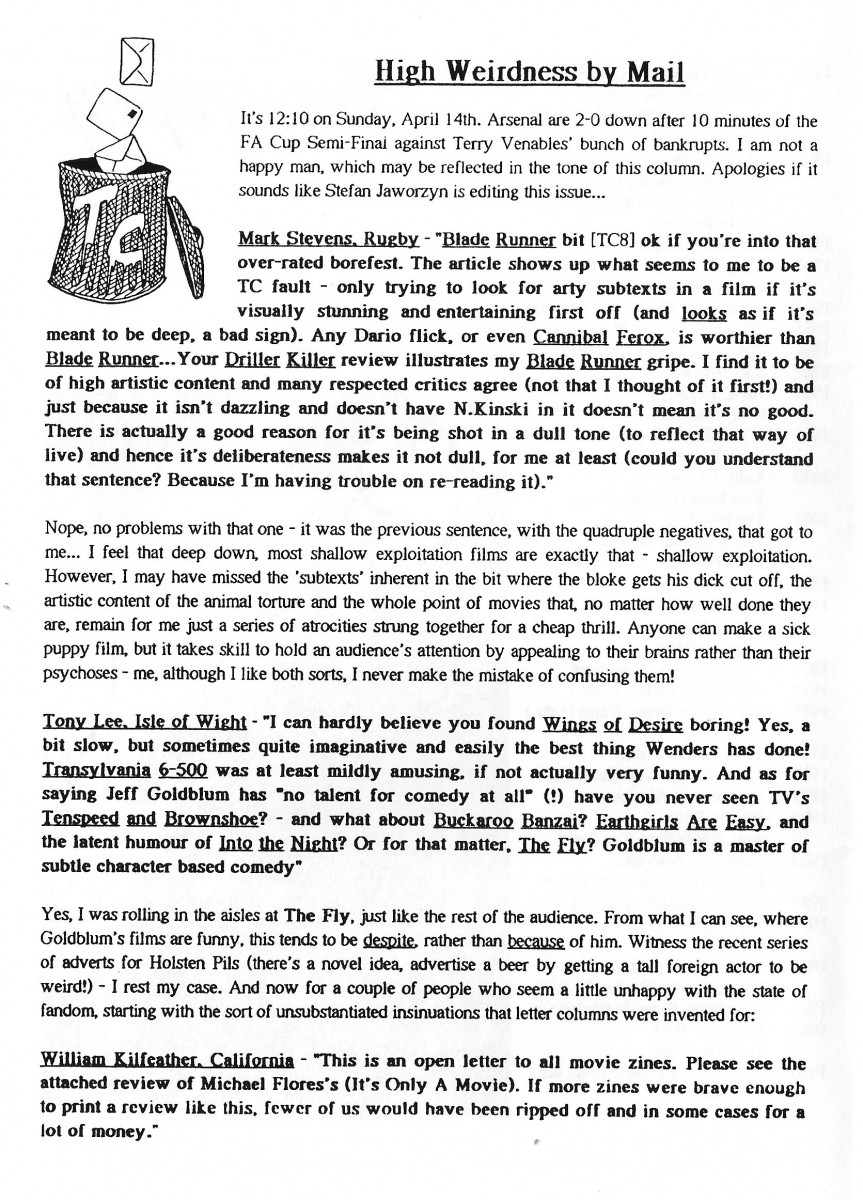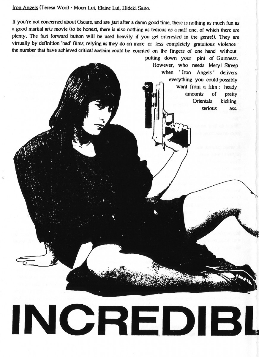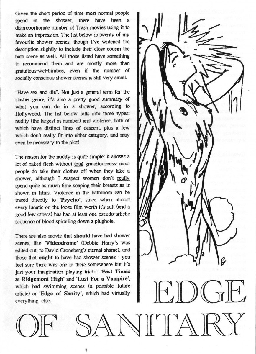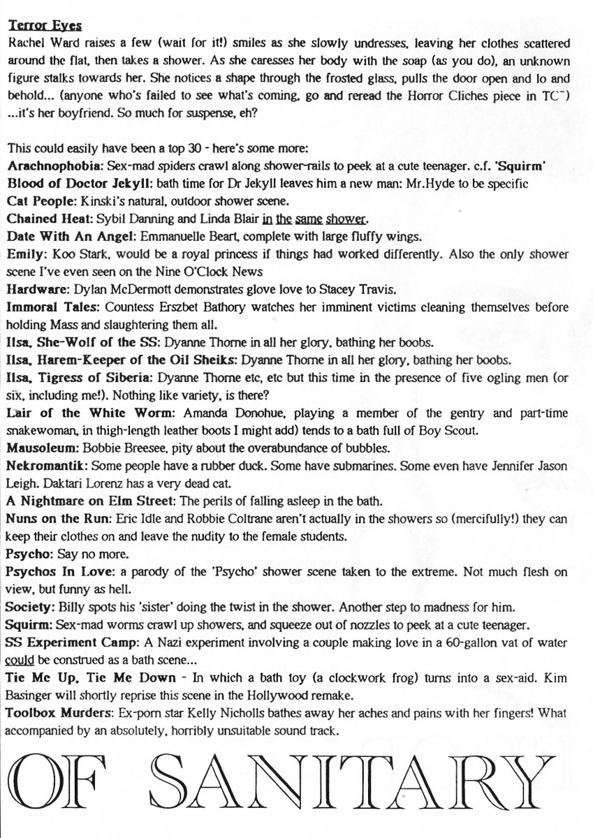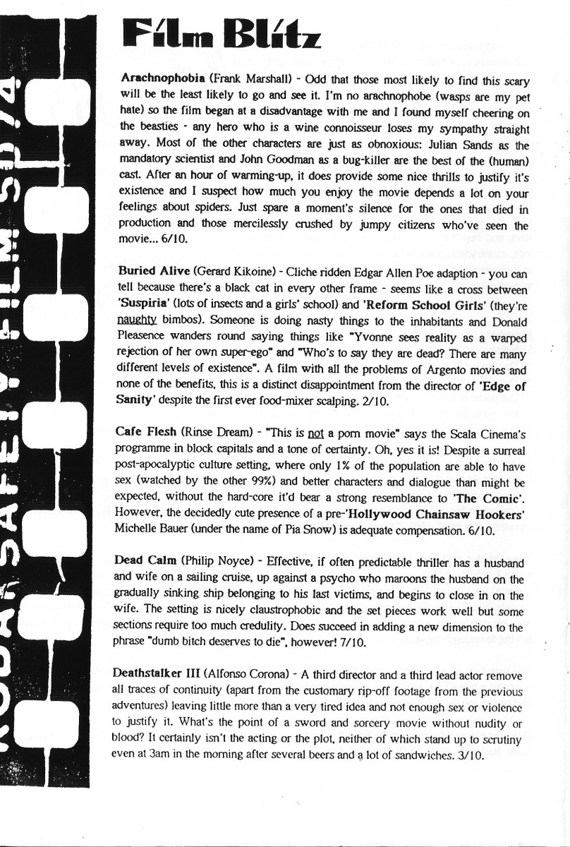 Thanks are due to Steve Rag, Dan Pydynkowski, Graf Hauser and Claire Blamey (all of whom have been feeding my NK obsession), Andy Waller, Paul Higson, Helen McCarthy, Stefan Kwiatkowski, Anthony Cawood, George Houston, John from Barlaston, Jay Felton, Tim Paxton, Damien Drake and Steve Moss. Congratulations to Fantasynopsis and Imaginator for taking the top places in Samhain’s ‘zine poll – definitely worthy winners. TC8 was available from Forbidden Planet, Fantasy Inn and Psychotronic Videos, London, plus Videodrom, Berlin and Forbidden Planet, Cardiff – maybe the last named will get round to paying me for the issues I sent them at some point?