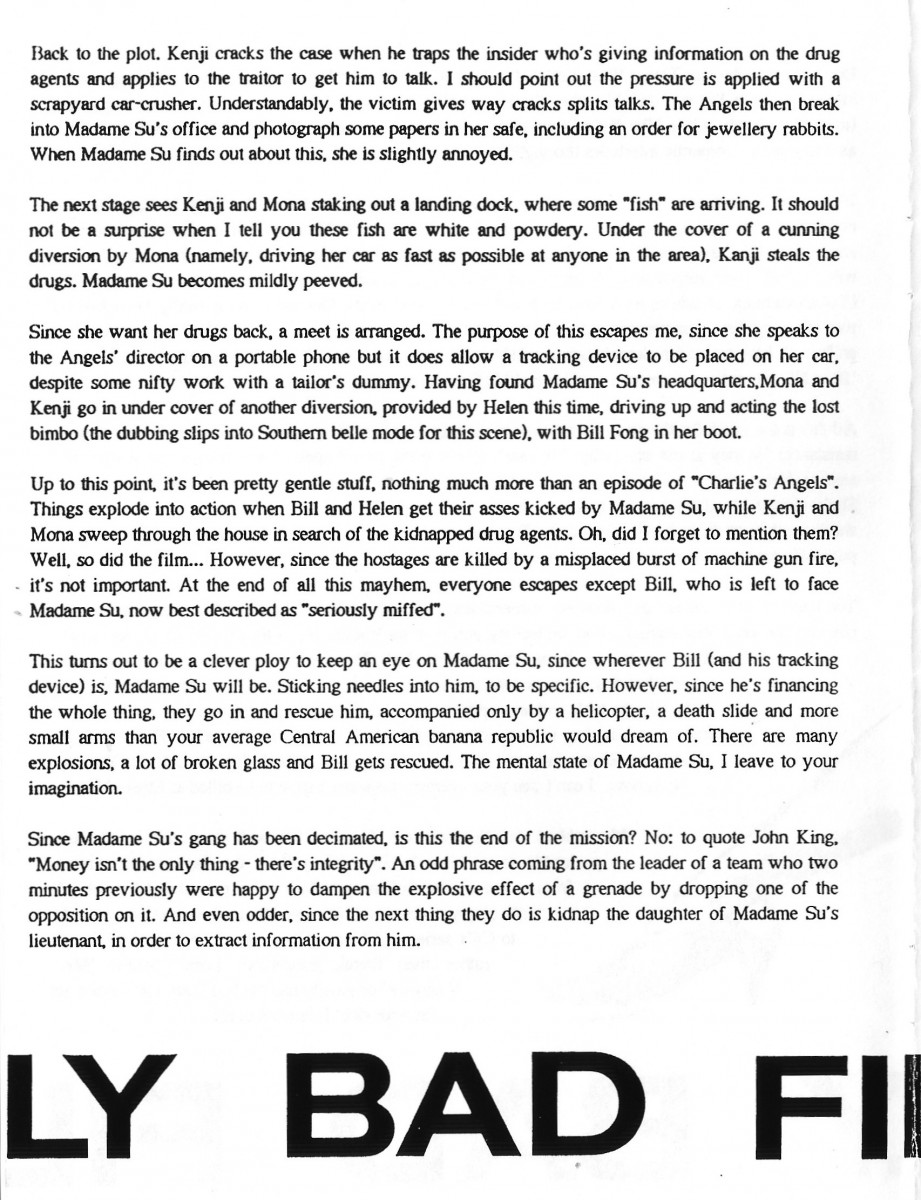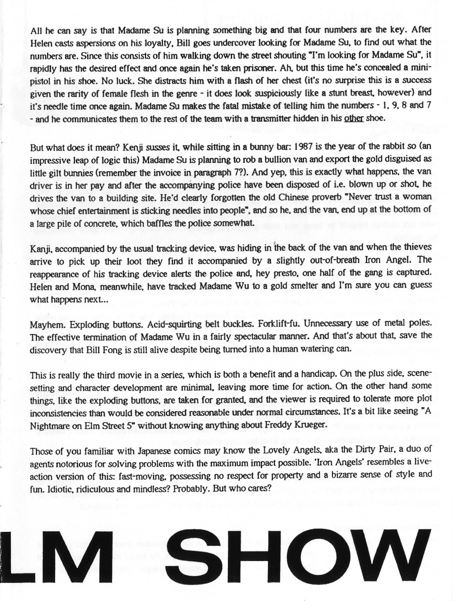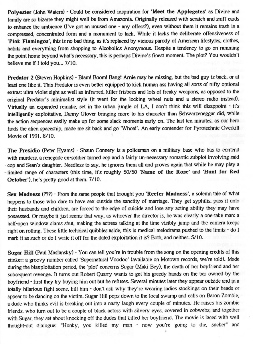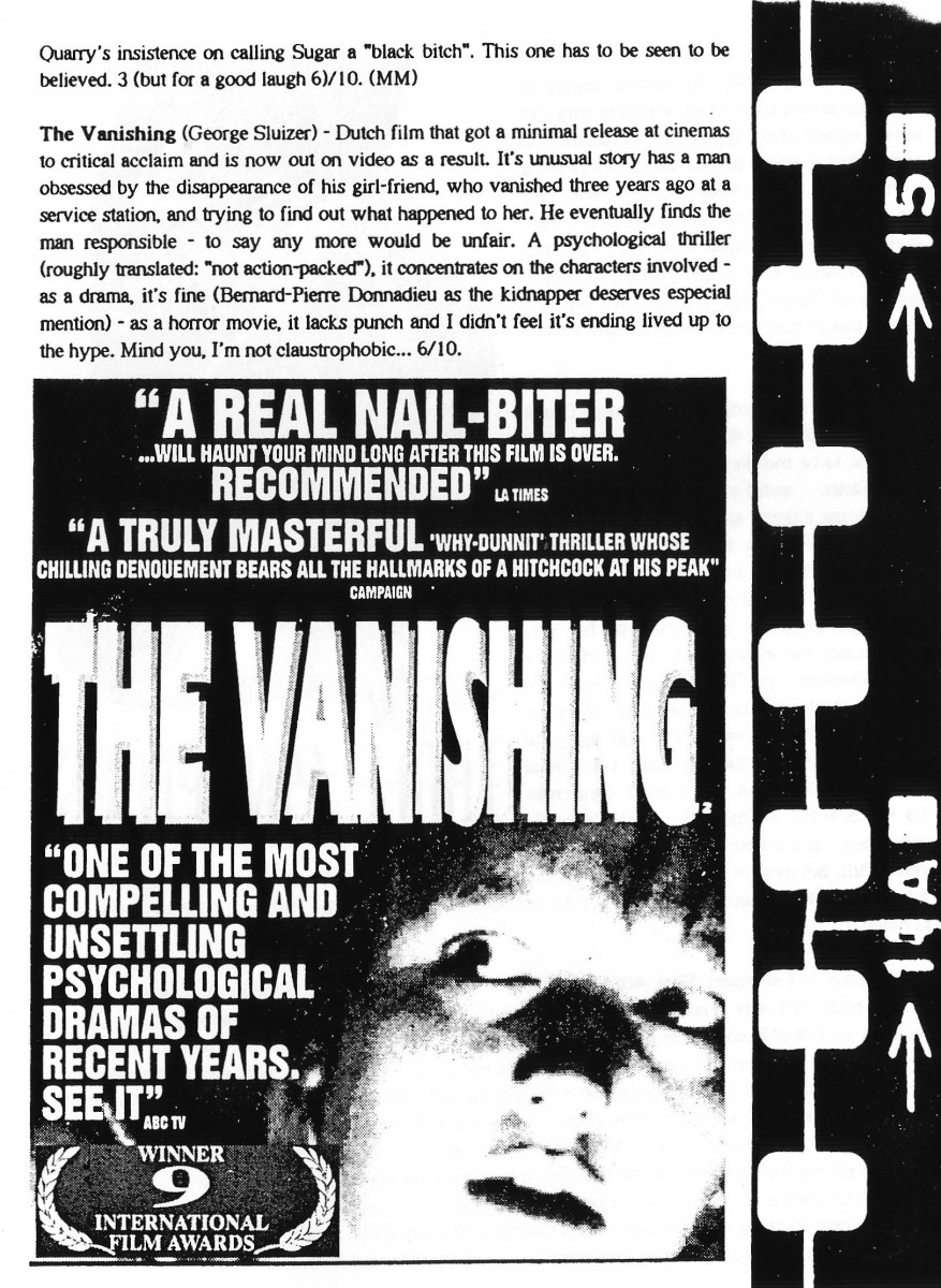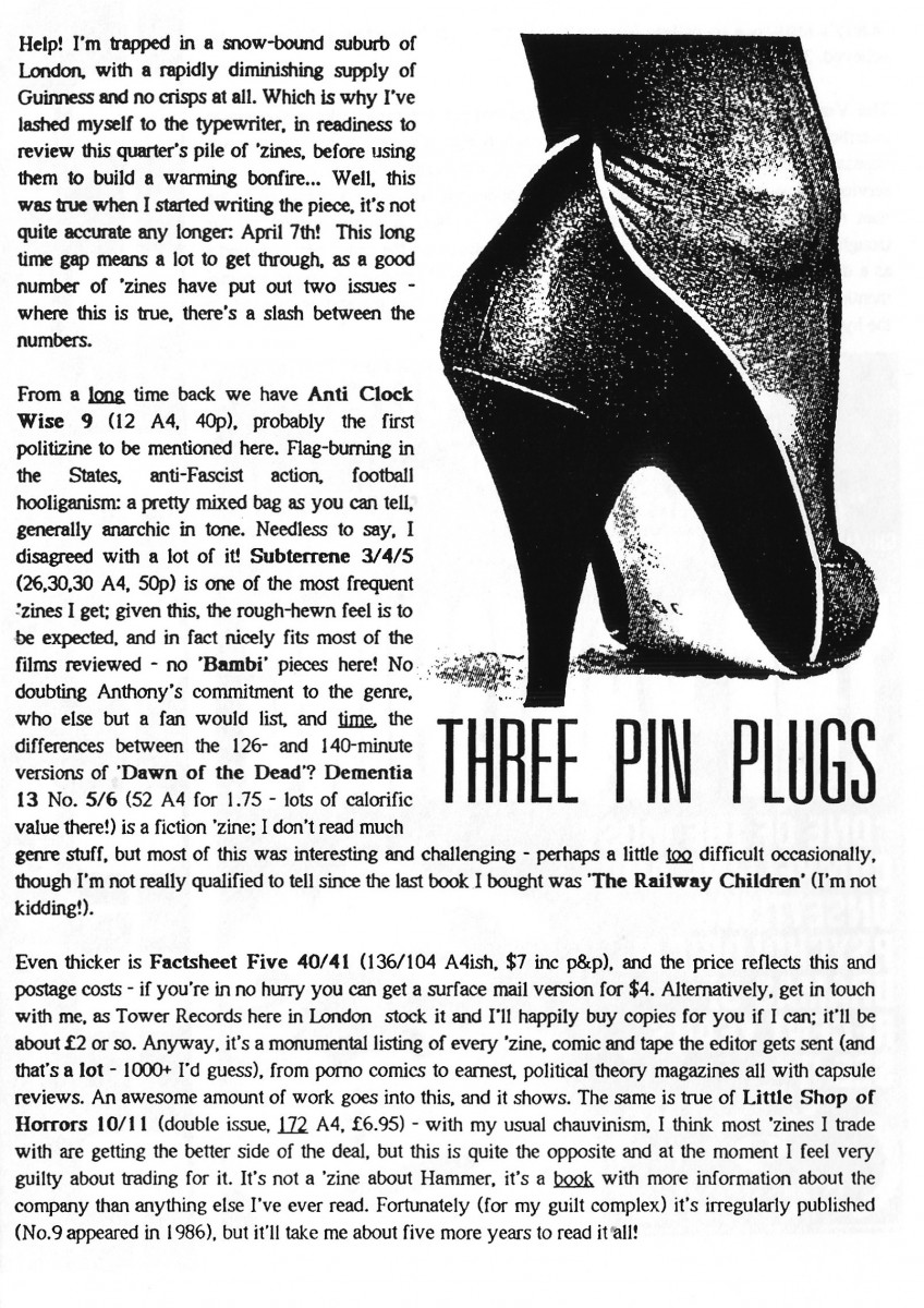 Thanks are due to Steve Rag, Dan Pydynkowski, Graf Hauser and Claire Blamey (all of whom have been feeding my NK obsession), Andy Waller, Paul Higson, Helen McCarthy, Stefan Kwiatkowski, Anthony Cawood, George Houston, John from Barlaston, Jay Felton, Tim Paxton, Damien Drake and Steve Moss. Congratulations to Fantasynopsis and Imaginator for taking the top places in Samhain’s ‘zine poll – definitely worthy winners. TC8 was available from Forbidden Planet, Fantasy Inn and Psychotronic Videos, London, plus Videodrom, Berlin and Forbidden Planet, Cardiff – maybe the last named will get round to paying me for the issues I sent them at some point?