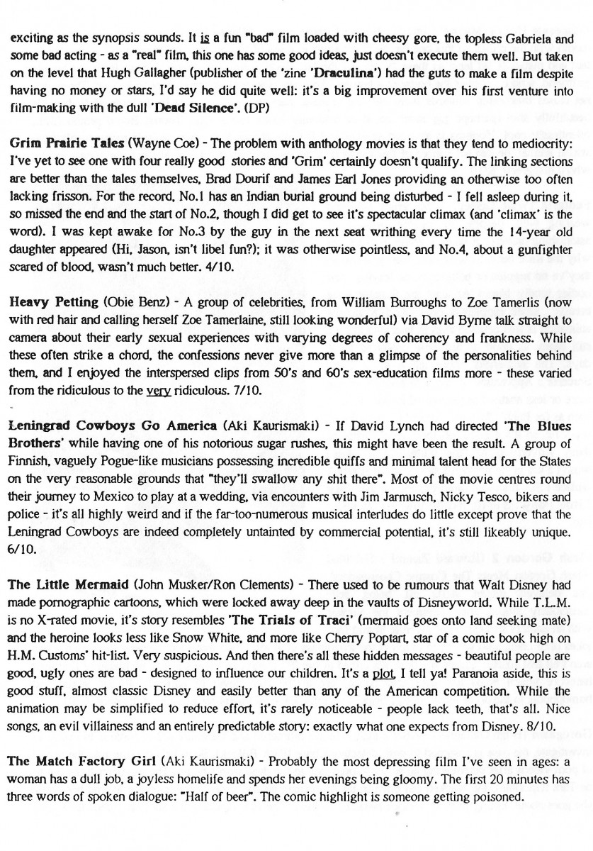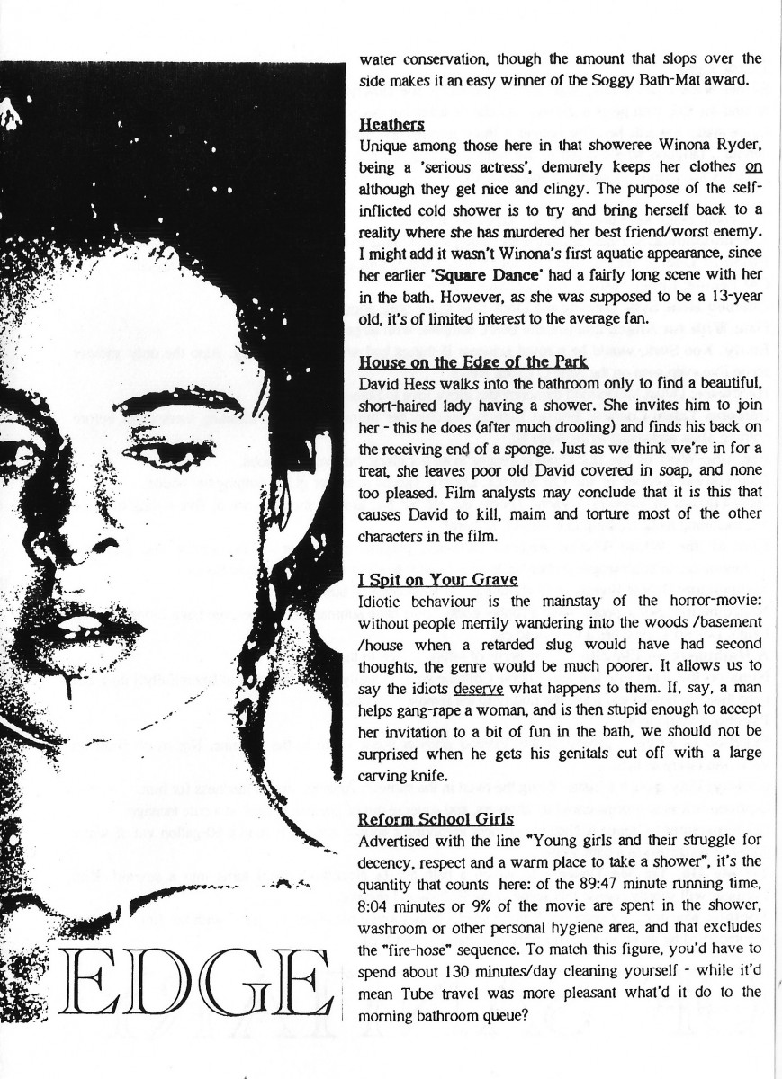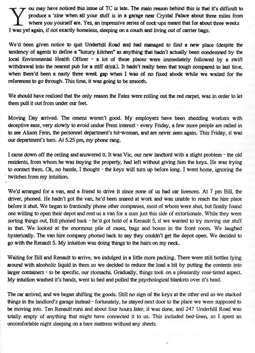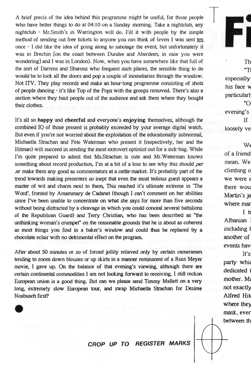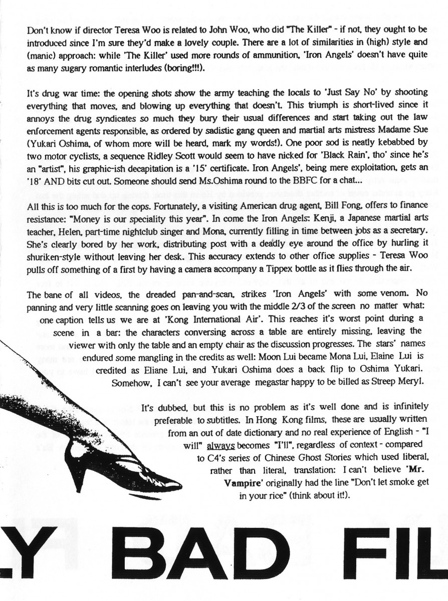 Thanks are due to Steve Rag, Dan Pydynkowski, Graf Hauser and Claire Blamey (all of whom have been feeding my NK obsession), Andy Waller, Paul Higson, Helen McCarthy, Stefan Kwiatkowski, Anthony Cawood, George Houston, John from Barlaston, Jay Felton, Tim Paxton, Damien Drake and Steve Moss. Congratulations to Fantasynopsis and Imaginator for taking the top places in Samhain’s ‘zine poll – definitely worthy winners. TC8 was available from Forbidden Planet, Fantasy Inn and Psychotronic Videos, London, plus Videodrom, Berlin and Forbidden Planet, Cardiff – maybe the last named will get round to paying me for the issues I sent them at some point?