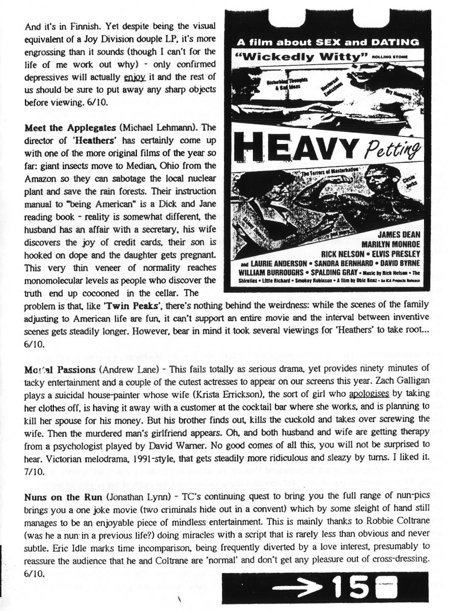 One final tweak to the top 10 films of 1990, following Xmas viewing. ‘Meet the Feebles’ doesn’t stand up to repeated viewing so is replaced by ‘In the Line of Duty 4’, which gets better on reviewing. And a comic book to recommend: ‘Squeak the Mouse’, Tom & Jerry crossed with every splatter movie you’ve seen. It was recommended to me some time ago by a reader (can’t remember who!) but it’s taken a while to get hold of a copy, since Customs seem to have been great fans of it… ‘Meet the Applegates’ did indeed improve on a second viewing – while it’s still no ‘Heathers’, it’s a neat little movie. I saw a trailer for Michael Lehmann’s next film, ‘Hudson Hawke’ recently: I’m not overly optimistic…