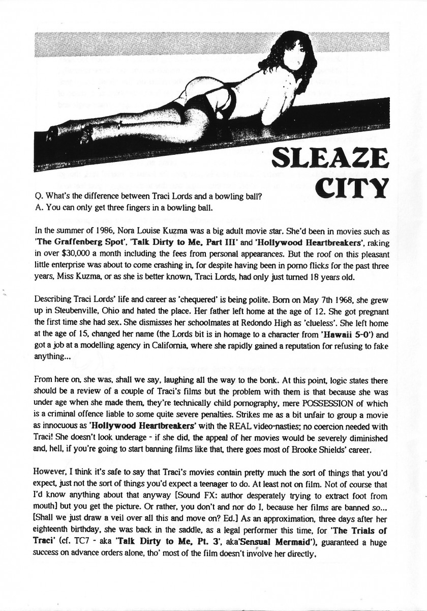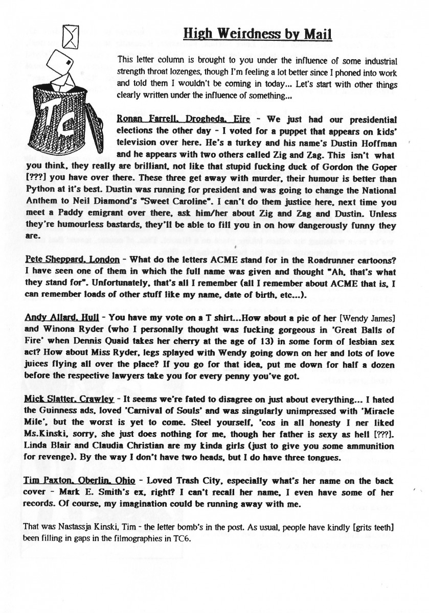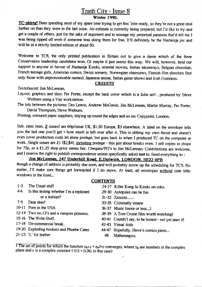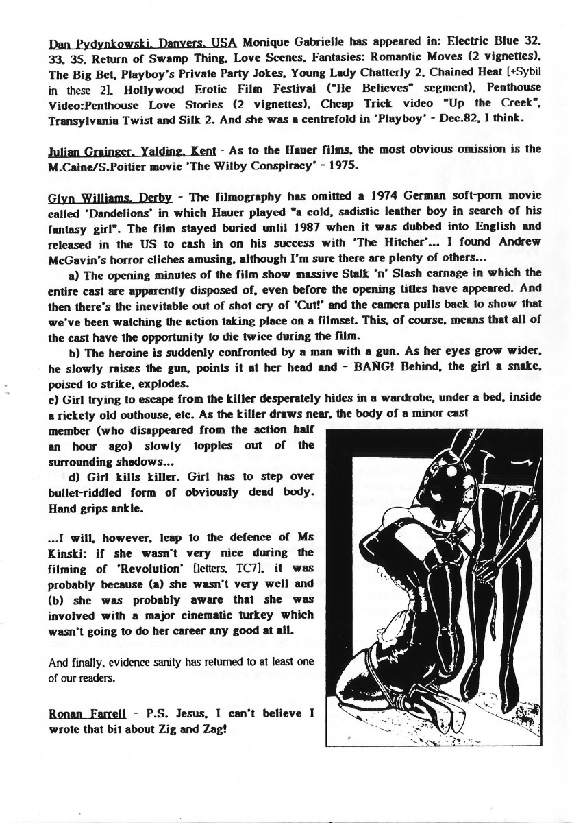 Here’s all the bits that I didn’t want the printer to see, mind you if he can cope with dead pictures of Marilyn Monroe, I can’t see why he would balk at drawings of naked chainsaw-wielding blood-spattered sexpots. Nah, it’s here more because I didn’t have room for it in the ‘zine proper. Overleaf, if you hadn’t already guessed, is The Picture. This is the one that Clearaprint refused to put on a T•shirt – the original is in colour and looks a HELL of a tot better, but it’ll give you an idea of the content of the picture if nothing else (should you want to indulge in a little spot of colouring-by-numbers, the bedsheet at the bottom is blue, the chainsaw is grey (with red splatters and Nastassja is a sort of pinky-brown). I’d like to gauge the interest in T-shirts with this picture on (not forgetting the words ‘TRASH CITY – the T-shirt they tried to ban!’) so I can get the numbers right, not wanting to be left with 300 sleazy shirts on my hands! Cost is now uncertain, but should be round about seven or eight pounds.