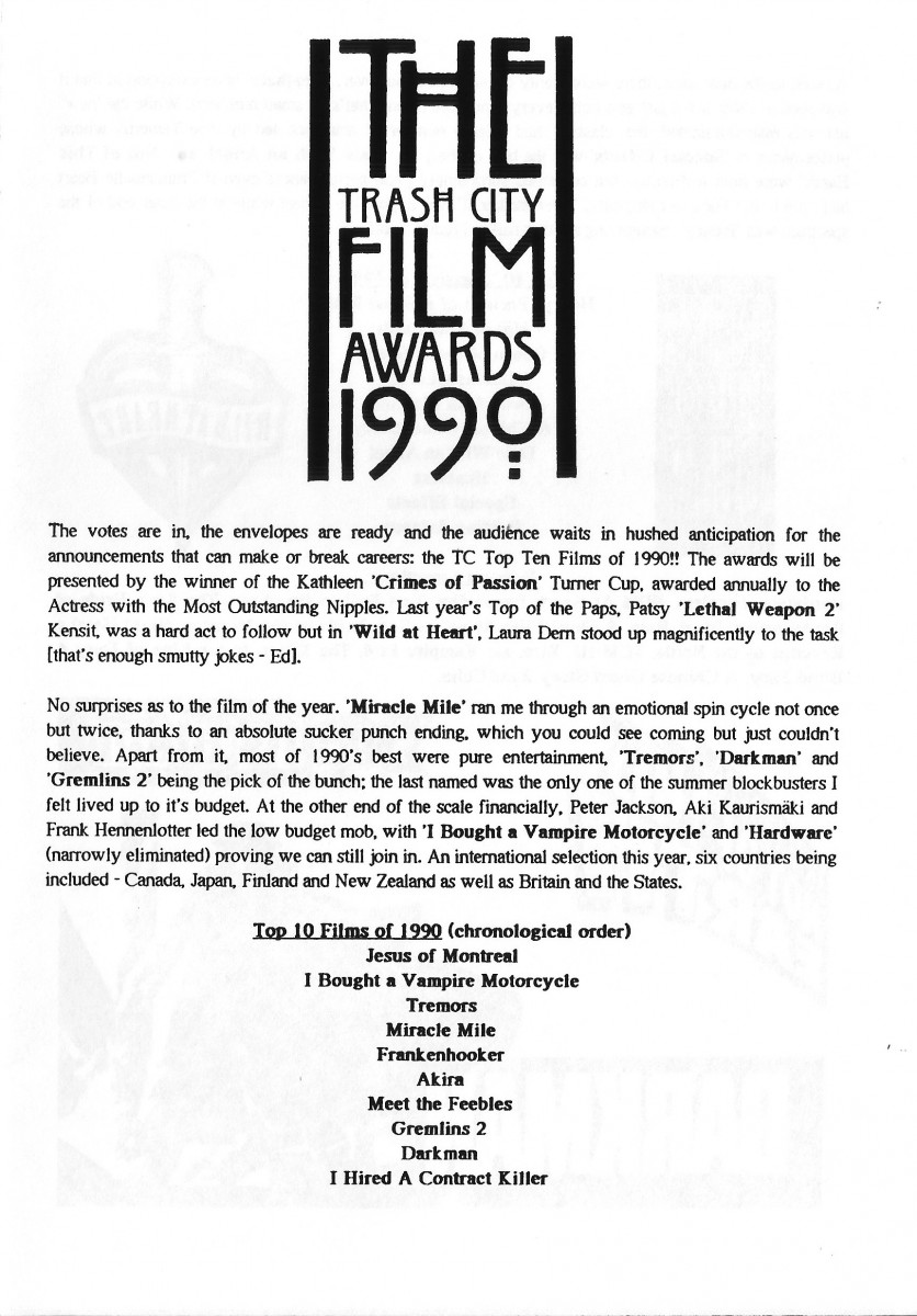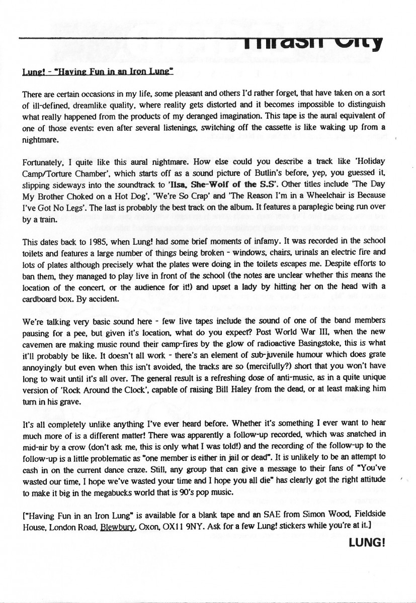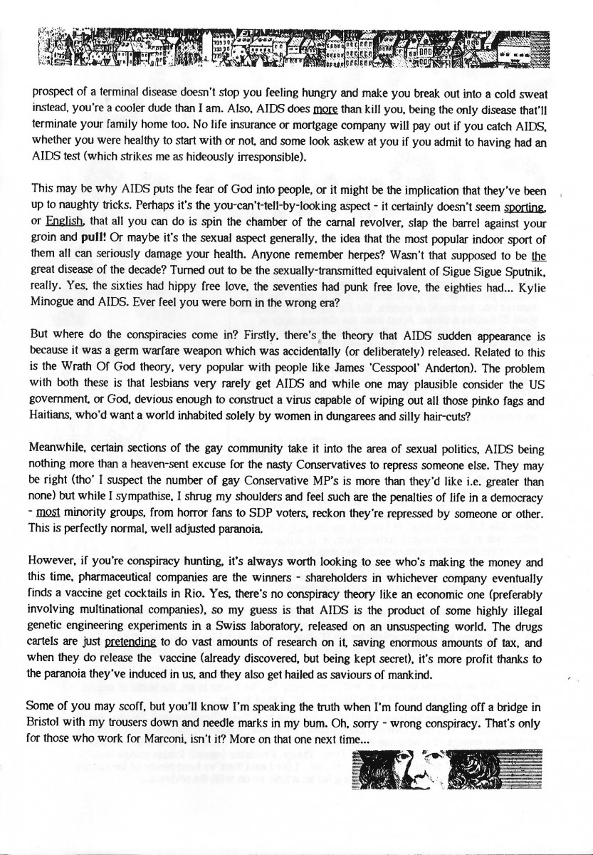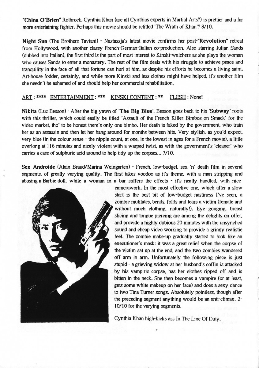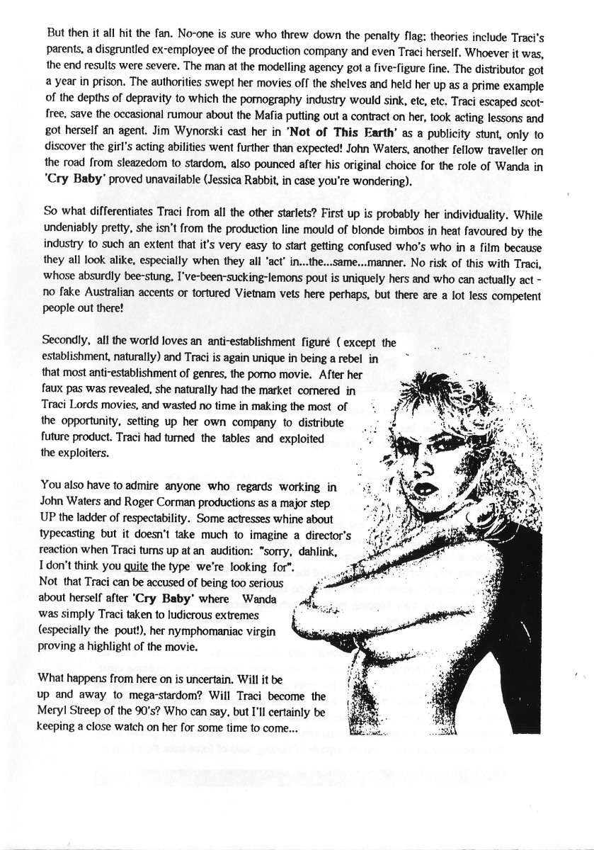 Here’s all the bits that I didn’t want the printer to see, mind you if he can cope with dead pictures of Marilyn Monroe, I can’t see why he would balk at drawings of naked chainsaw-wielding blood-spattered sexpots. Nah, it’s here more because I didn’t have room for it in the ‘zine proper. Overleaf, if you hadn’t already guessed, is The Picture. This is the one that Clearaprint refused to put on a T•shirt – the original is in colour and looks a HELL of a tot better, but it’ll give you an idea of the content of the picture if nothing else (should you want to indulge in a little spot of colouring-by-numbers, the bedsheet at the bottom is blue, the chainsaw is grey (with red splatters and Nastassja is a sort of pinky-brown). I’d like to gauge the interest in T-shirts with this picture on (not forgetting the words ‘TRASH CITY – the T-shirt they tried to ban!’) so I can get the numbers right, not wanting to be left with 300 sleazy shirts on my hands! Cost is now uncertain, but should be round about seven or eight pounds.