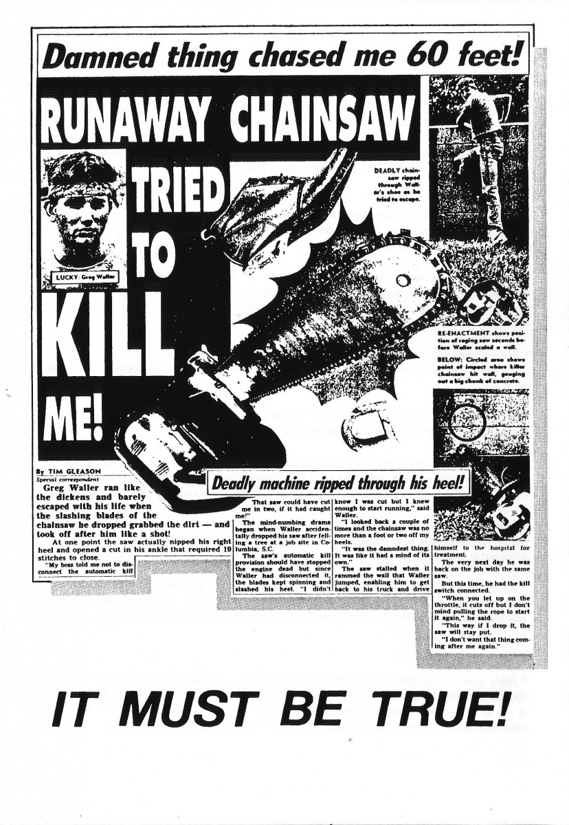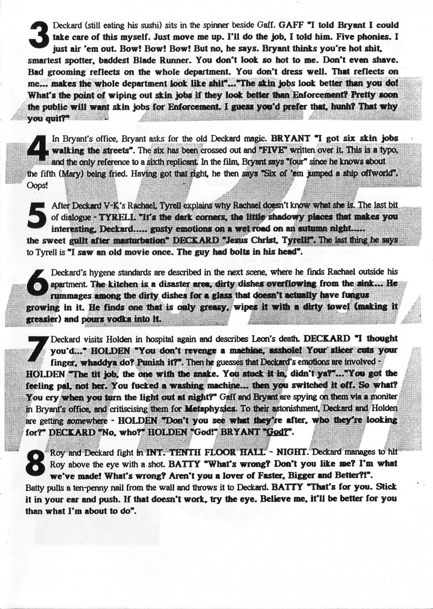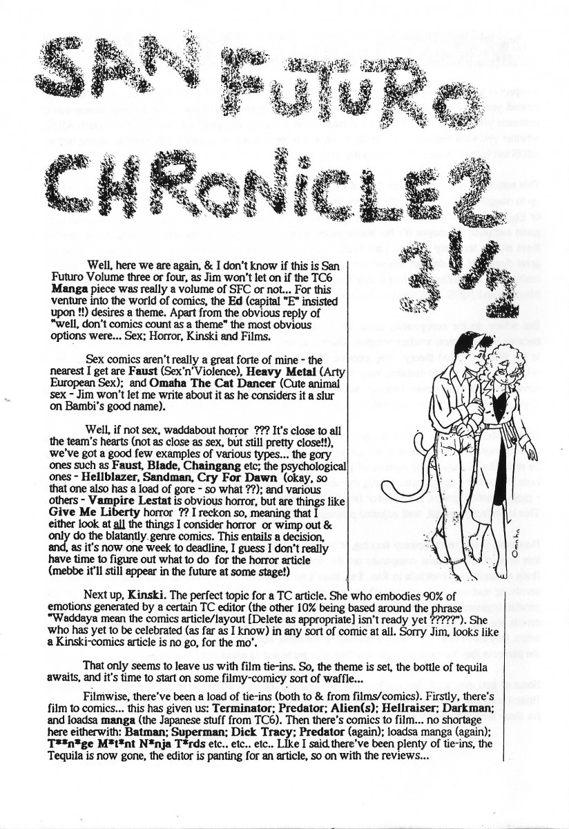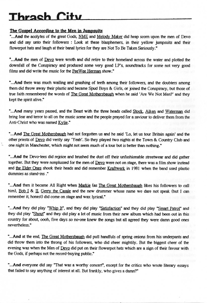 Here’s all the bits that I didn’t want the printer to see, mind you if he can cope with dead pictures of Marilyn Monroe, I can’t see why he would balk at drawings of naked chainsaw-wielding blood-spattered sexpots. Nah, it’s here more because I didn’t have room for it in the ‘zine proper. Overleaf, if you hadn’t already guessed, is The Picture. This is the one that Clearaprint refused to put on a T•shirt – the original is in colour and looks a HELL of a tot better, but it’ll give you an idea of the content of the picture if nothing else (should you want to indulge in a little spot of colouring-by-numbers, the bedsheet at the bottom is blue, the chainsaw is grey (with red splatters and Nastassja is a sort of pinky-brown). I’d like to gauge the interest in T-shirts with this picture on (not forgetting the words ‘TRASH CITY – the T-shirt they tried to ban!’) so I can get the numbers right, not wanting to be left with 300 sleazy shirts on my hands! Cost is now uncertain, but should be round about seven or eight pounds.