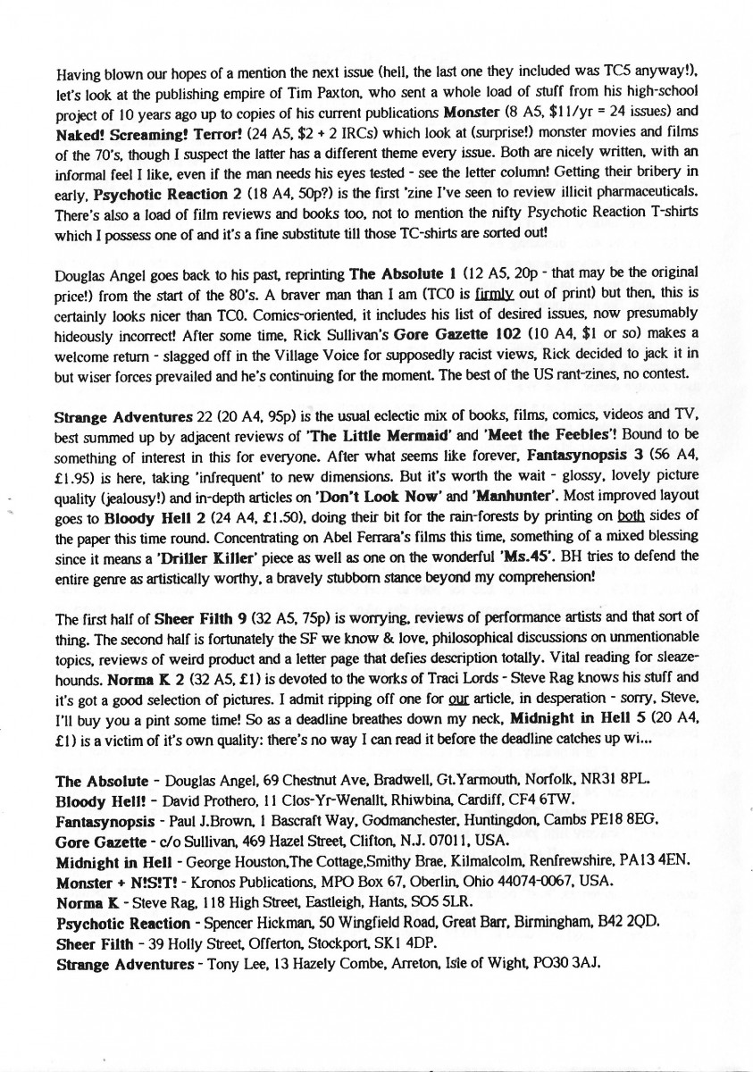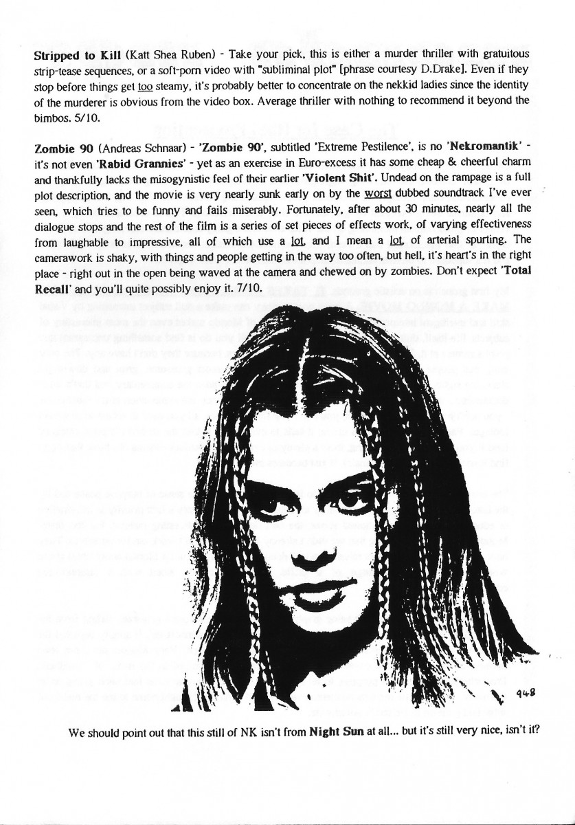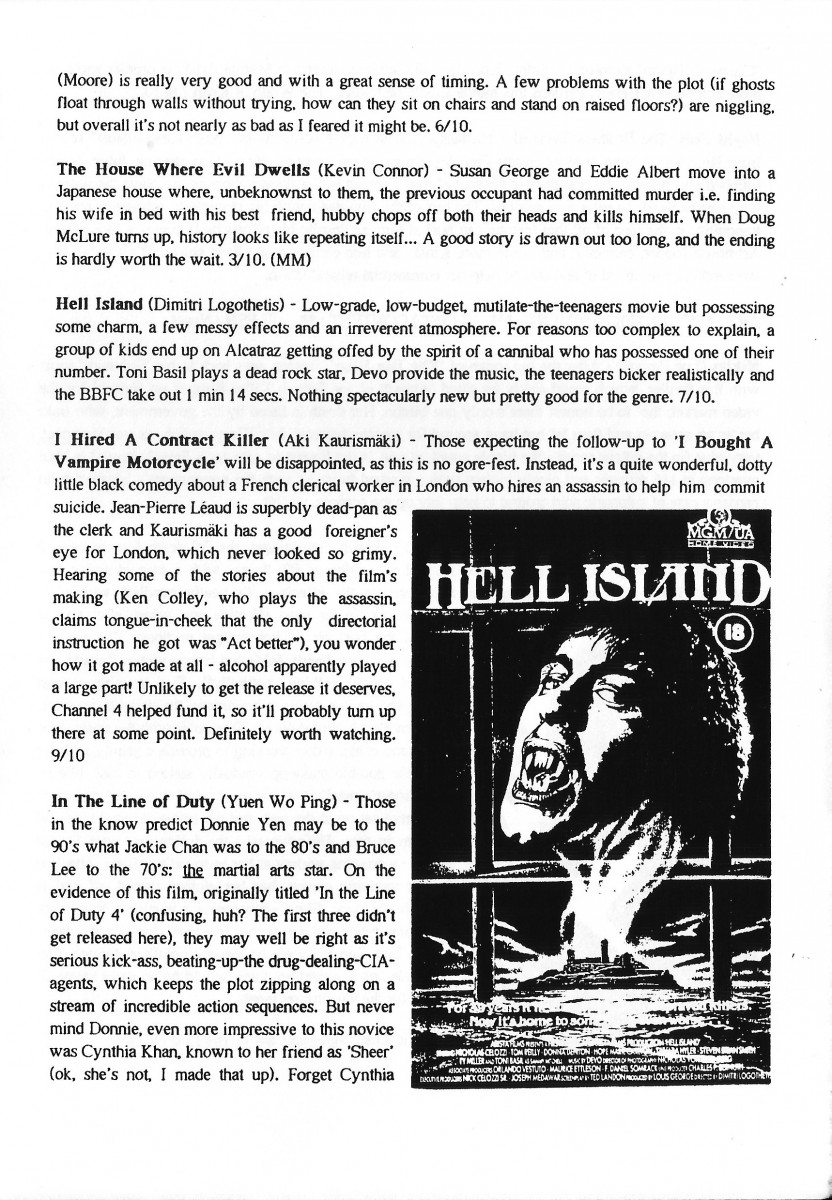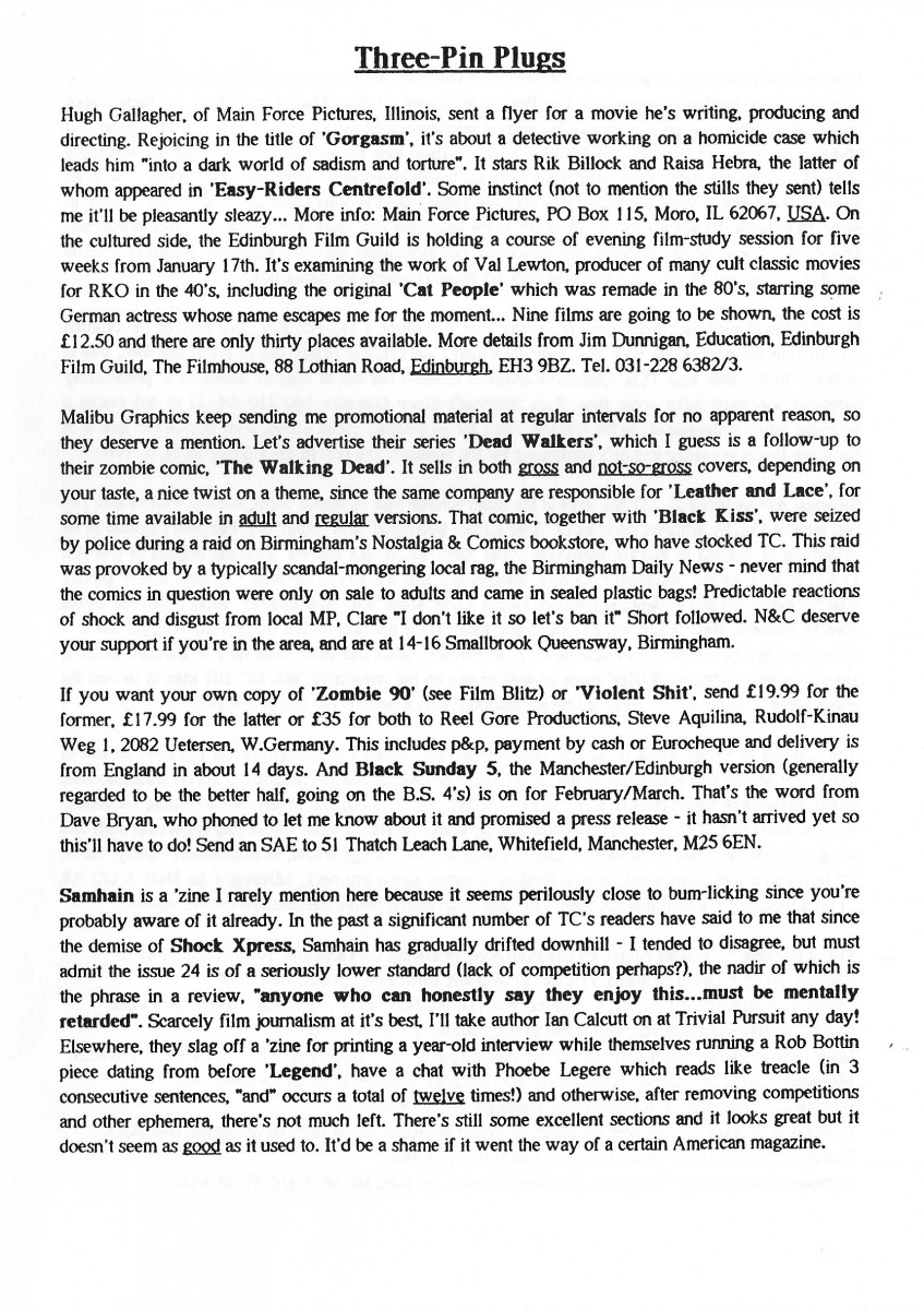 Just room for a swift plug for Andy Allard, who’s trying to organise a series of thematic retro presentations in (of all places) Scunthorpe. The first one was on Saturday October 27th, with Evil Dead 1 & 2, Videodrome, A Nightmare on Elm Street and C*rn*v*l *f S**ls (hell, 4 out of 5 ain’t bad!), all for four quid. For information on future events write to : A.Allard, Flat 6, 17 Westbourne Avenue, Hull, HU5 3HN.