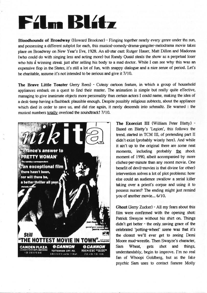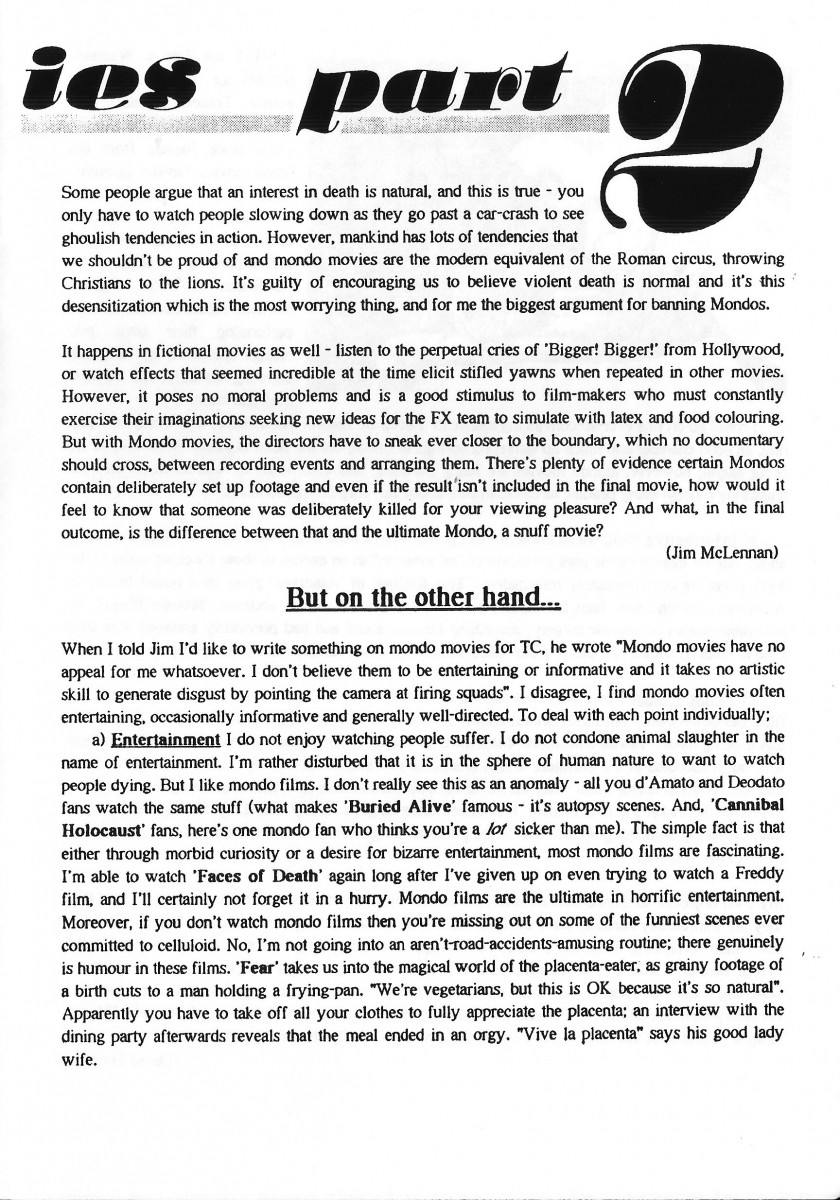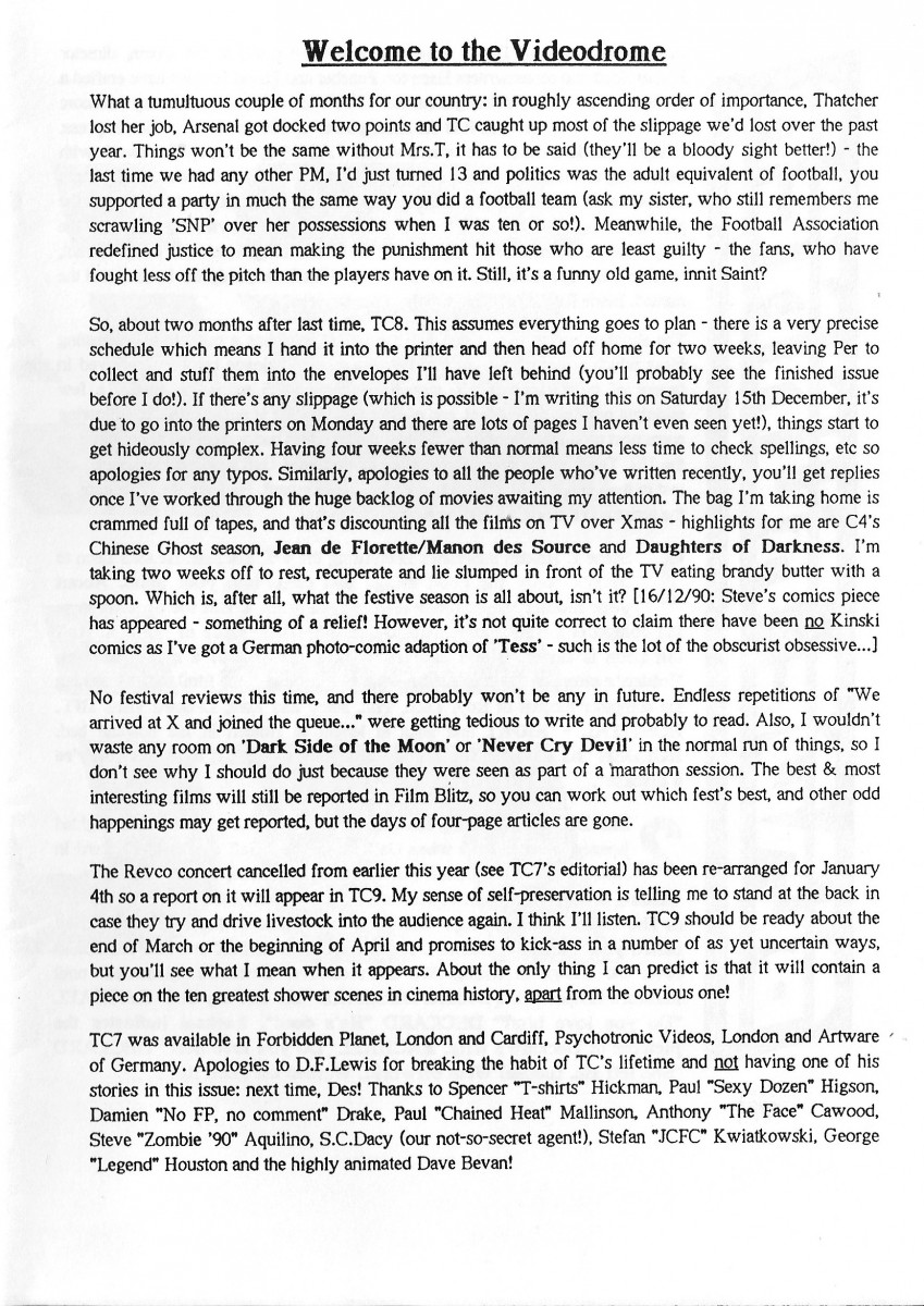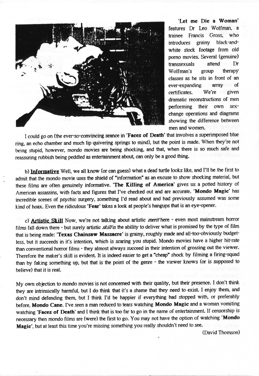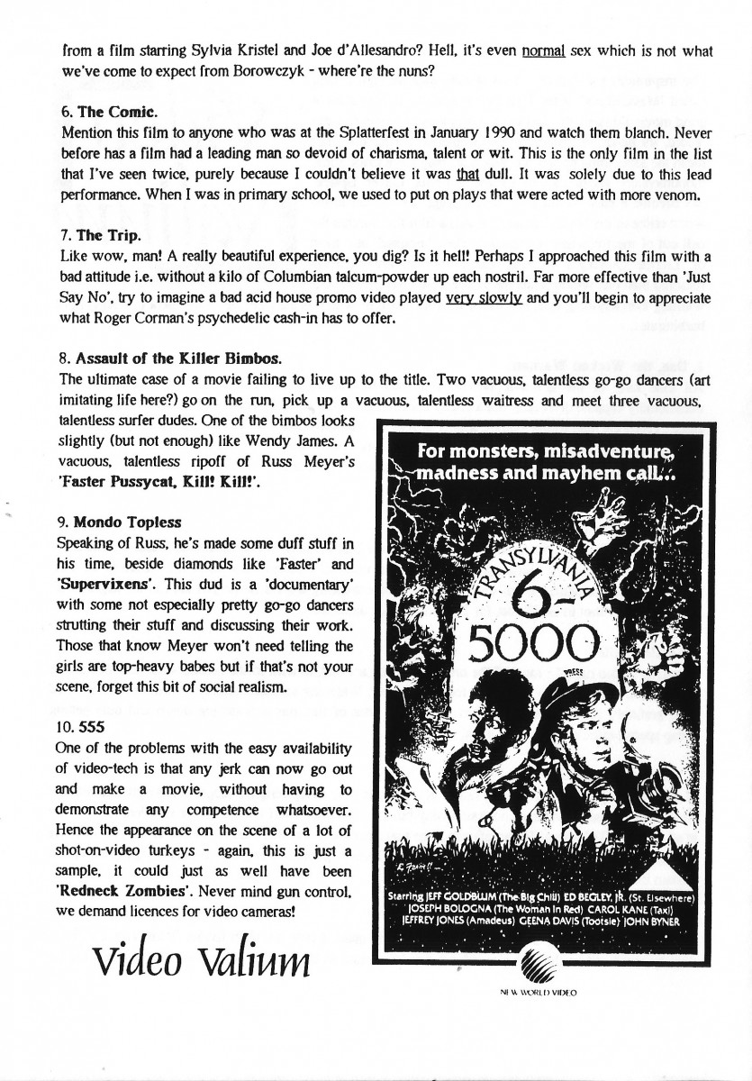 Just room for a swift plug for Andy Allard, who’s trying to organise a series of thematic retro presentations in (of all places) Scunthorpe. The first one was on Saturday October 27th, with Evil Dead 1 & 2, Videodrome, A Nightmare on Elm Street and C*rn*v*l *f S**ls (hell, 4 out of 5 ain’t bad!), all for four quid. For information on future events write to : A.Allard, Flat 6, 17 Westbourne Avenue, Hull, HU5 3HN.